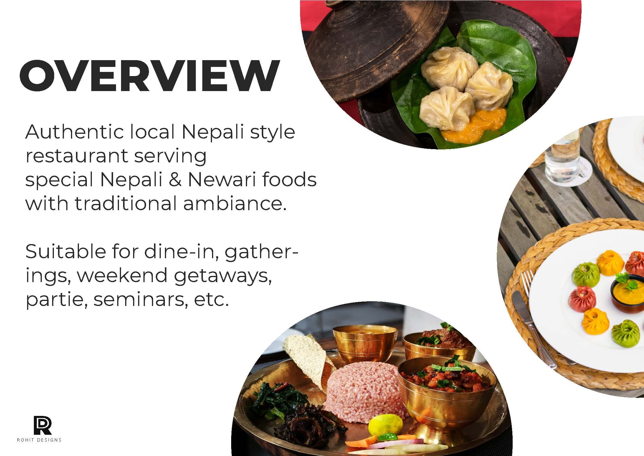 Authentic local Nepali style restaurant serving special Nepali & Newari foods with traditional ambiance. Suitable for dine-in, gatherings, weekend getaways, partie, seminars, etc.