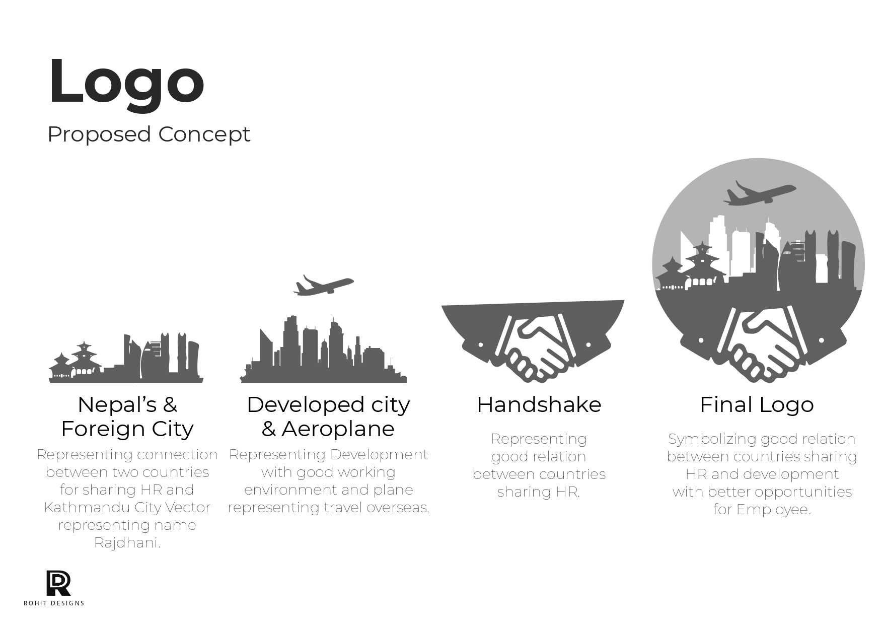 - Handshake – Signifies strong international relations, trust, and partnership in HR exchange between nations. This design effectively conveys the brand’s mission of bridging countries through workforce mobility and fostering global collaboration.