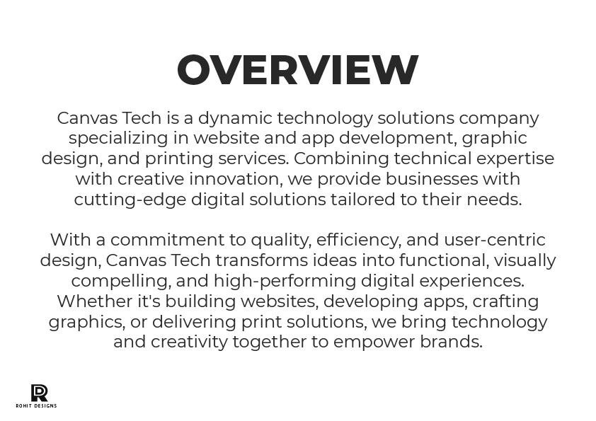 Canvas Tech is a dynamic technology solutions company specializing in website and app development, graphic design, and printing services. Combining technical expertise with creative innovation, we provide businesses with cutting-edge digital solutions tailored to their needs. With a commitment to quality, efficiency, and user-centric design, Canvas Tech transforms ideas into functional, visually compelling, and high-performing digital experiences. Whether it's building websites, developing apps, crafting graphics, or delivering print solutions, we bring technology and creativity together to empower brands.
